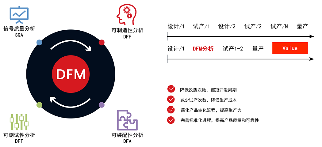 模擬從設(shè)計、制板到組裝的整個生產(chǎn)過程,使用DFM理念的設(shè)計方式可以減少試產(chǎn)次數(shù),加快研發(fā)周期,